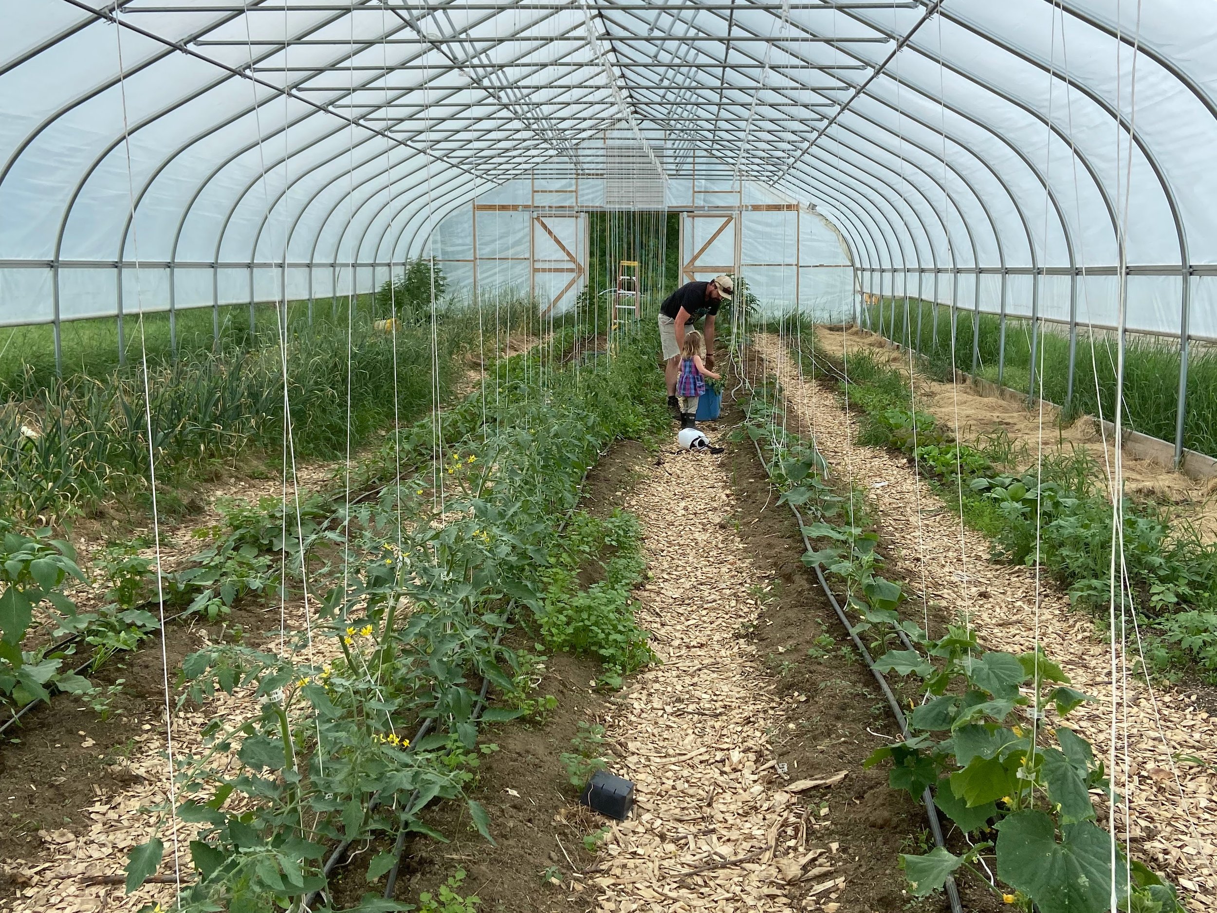 We are constantly told that our chicken just tastes better than what you can find at a grocery store or mega co-op. Flattering as it may be, this is simply because the chickens are raised in a healthy environment that allows them to actually be chickens- scratching, foraging as they travel our fields. We raise our chickens annually starting in April until September. They arrive to the post office as day old chicks and are directly settled into our brooder barn where they are kept for the first 2 to 3 weeks of their life before moving safely out to pasture. Once outside, the chickens live in a portable housing system called “chicken tractors” that keep them safe from predators and are pulled along our fields daily. As they move, they lay down natural fertilizer (manure), then each morning they once again start on new clean ground. Our chickens are USDA processed and air chilled at Maplewind Farm in Richmond, VT which allows us to offer both whole chickens and chicken parts for sale.